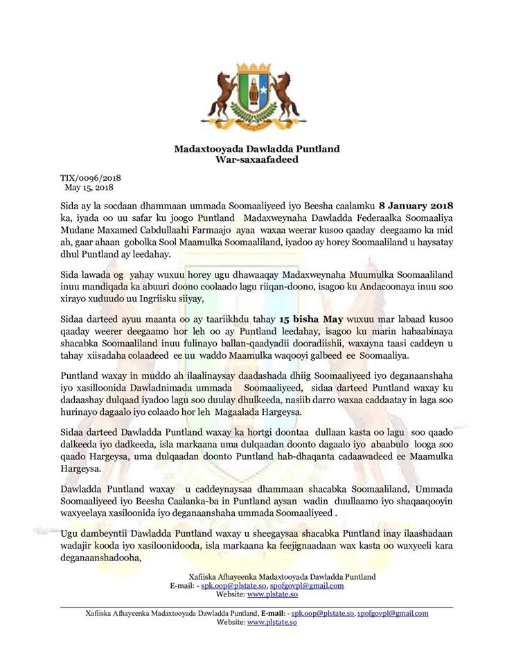 War kasoo baxay Madaxtooyadda Puntland ayaa looga hadlay dagaalka iyo waxyaabaha Sababay, waxaana Puntland ay ku eedeeysay Somaliland in ay dagaal kusoo qaadeen ciidamada Somaliland.