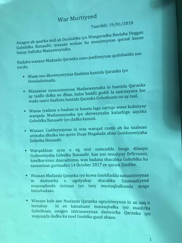 Shirkaan ayaa waxaa looga hadlay waxa hor taagan shirkii looga hadli lahaa Maqaamka gobolka Banaadir, iyo warqad shalay kasoo baxday Madaxtooyadda Soomaliya.