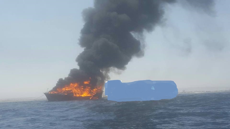 Doonta ayaa taagneyd meel dhanka Bari kaga beegan Badwaynta , waxaana dabku uu ka kacay Gudaha doonta.